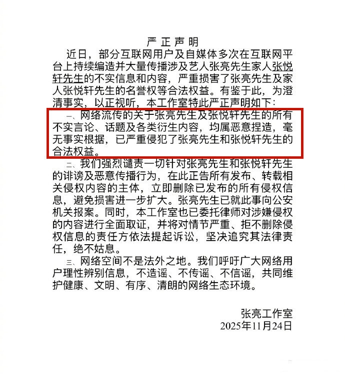 从该声明中可知,网传有关张亮和天天的内容属于恶意捏造,毫无事实根据,严重侵犯了张亮和天天的合法权益。
